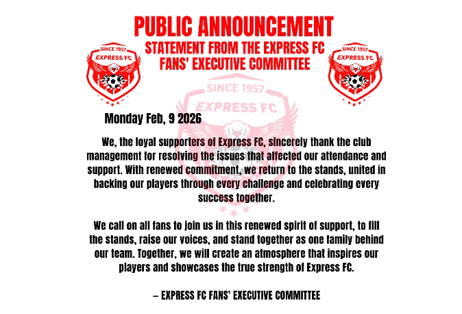 Express FC fans leadership has called the matchday boycott that has gone on for months. In a statement, the leadership, after meeting the club leadership to resolve their issues, encouraged fans to return to the stands starting this Saturday, 14th February 2026 as the 10th placed Red Eagles host second placed Entebbe UPPC at the Hamz Nakivubo stadium.