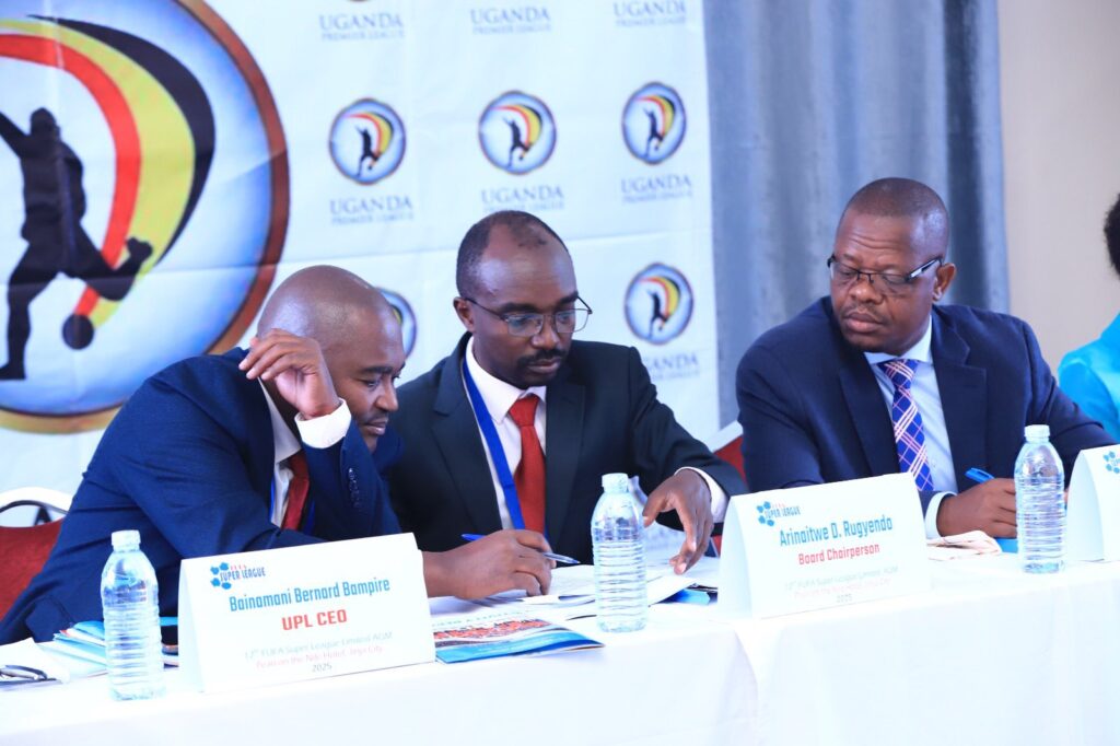UPL CEO Bernard Bainamani, board chairman Arinaitwe Rugyendo and FUFA President Moses Magogo (UPL PHOTO)