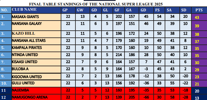 The season that started in April 2025 was played on home and away basis with Masaka Giants defending the title after topping the standings with 43 points.